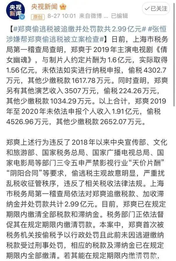 代孕的风云还没平,更严重的事又来了。2021年4月,张恒实名举报郑爽签“阴阳公约”、偷逃税。上海市税务局一查,服从让东说念主推奖:她拍《倩女阴魂》77天,片酬高达1.6亿元,日薪超208万,还通过公司增资的边幅藏了1.08亿,偷税漏税超7000万。