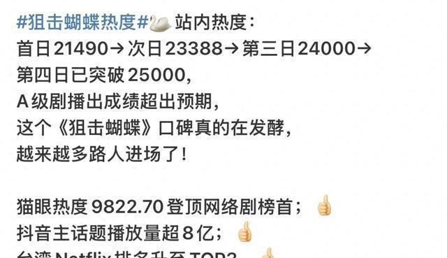 诚然现在收罗评价斟酌不一,阿栈如故乐此不疲地在追电视剧《狙击蝴蝶》。 开播才5天,抖音主话题播放量就超8亿,登顶热搜。