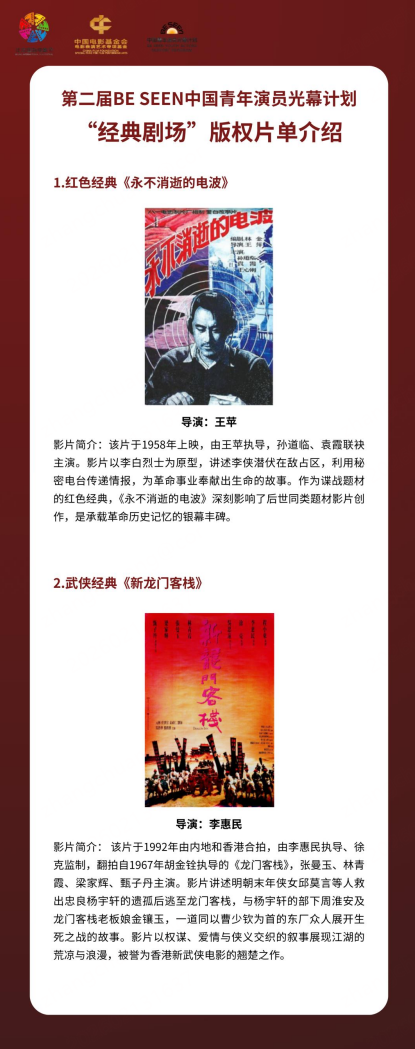 本届集训营不时BE SEEN光幕戏院厂牌,分设“经典戏院”与“实验戏院”两大板块。两个戏院均面向宇宙公开招募,“实验戏院”饱读吹原创叙事与类型更正,“经典戏院”则基于经典影片的版权合作,饱读吹存身传统、不雅照现代,尤其扫视红色经典确现代化传承与更正转化——本届推出的版权片单由谍战经典《永不用逝的电波》与武侠名作《新龙门东说念主皮客栈》共同组成,参与报名的短剧(脚本)导演团队可遴荐一部经典影片进行短剧改编。