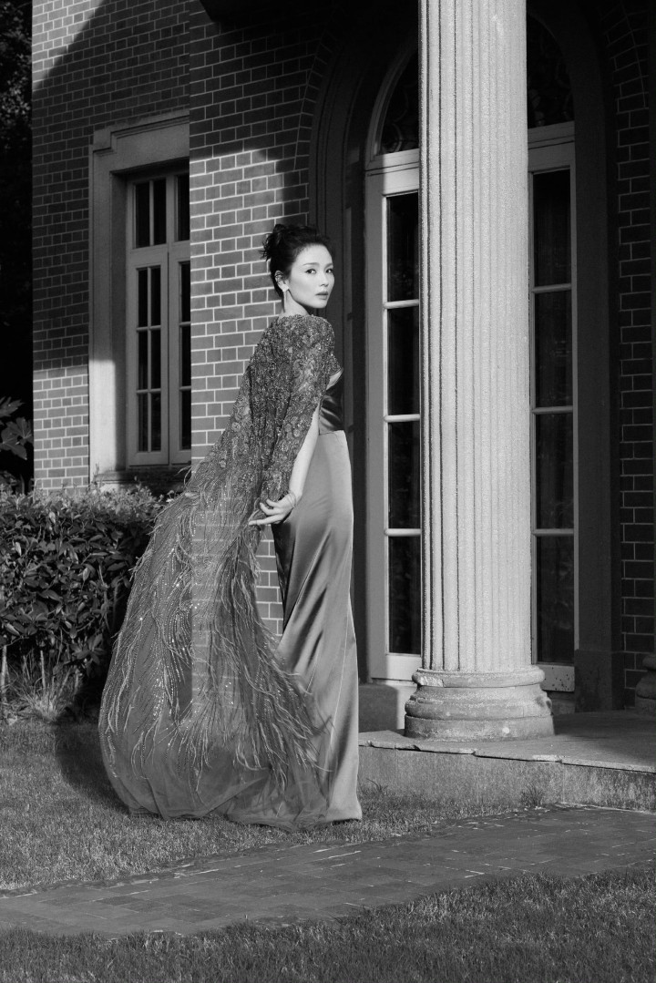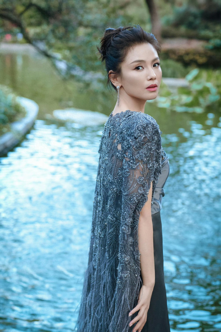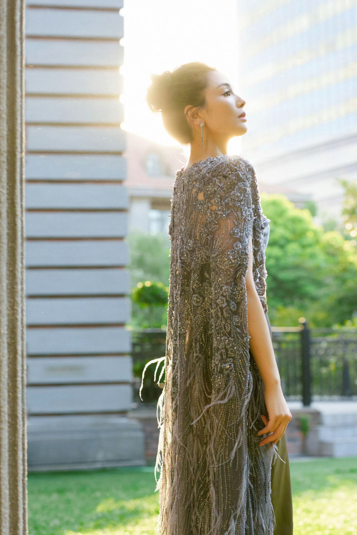 外层的蕾丝披肩缀满邃密珠片与刺绣,似暗夜星辉般忽闪,角落垂落的羽毛流苏随看成轻轻扬起,又为举座增添了几分灵动秀逸的东方诗意。盘起的发髻搭配高超耳环,更衬得她气质介怀典雅。
